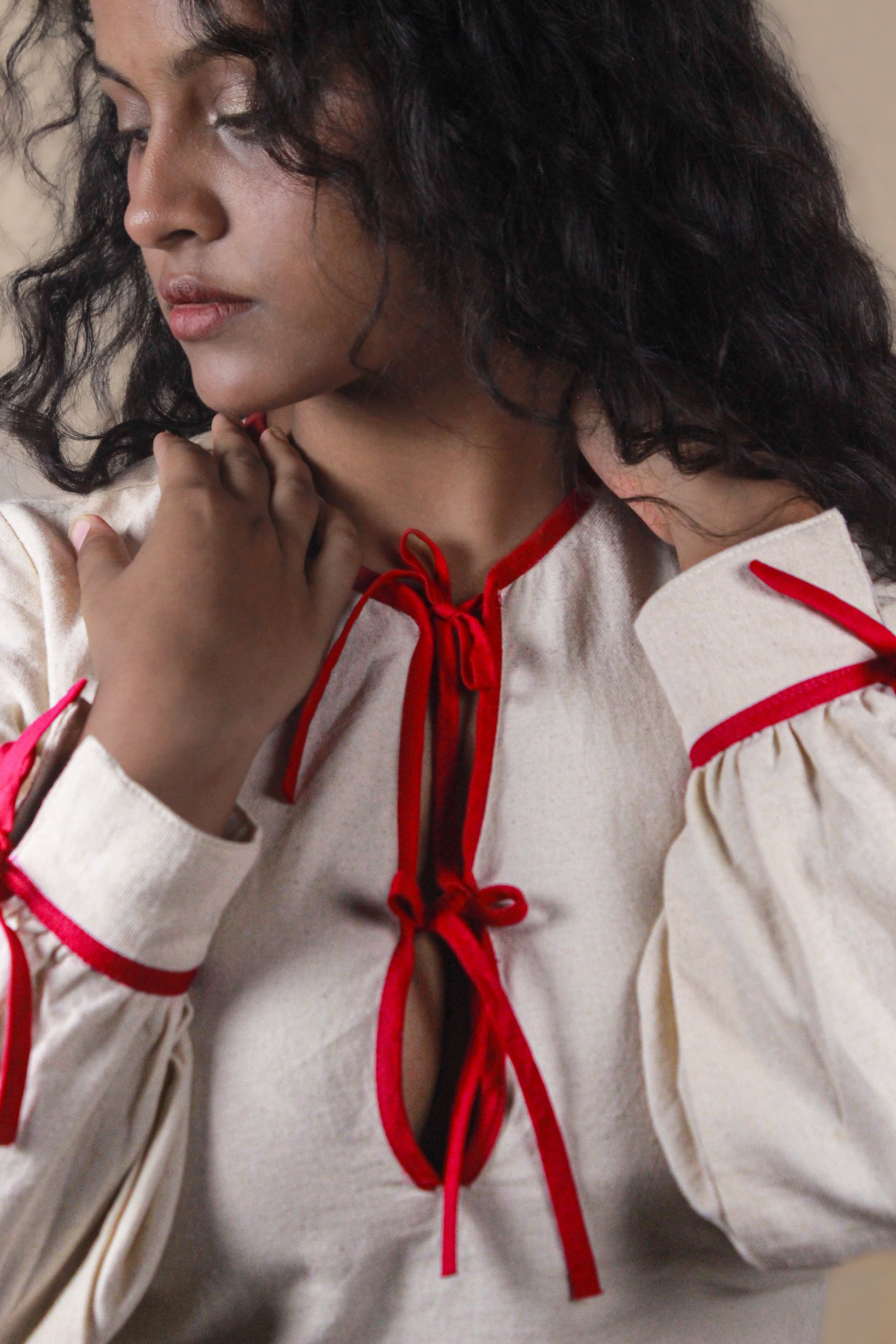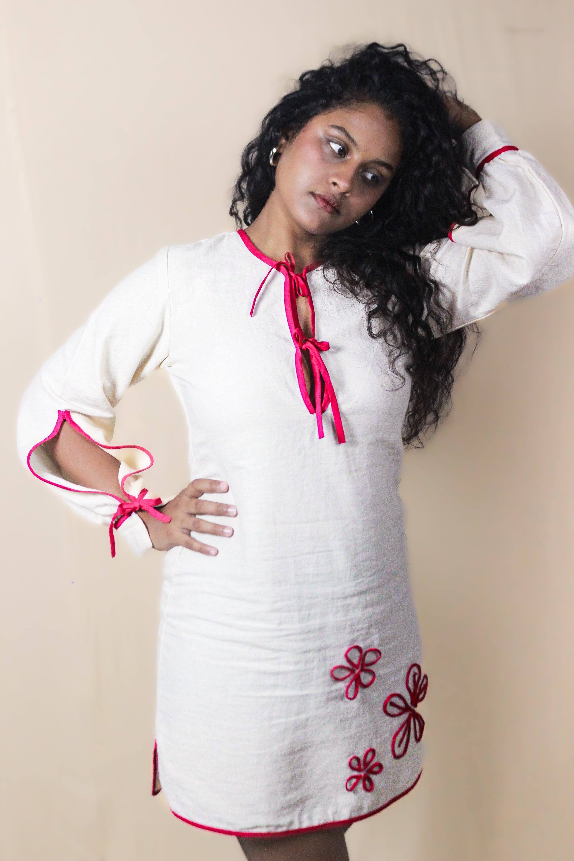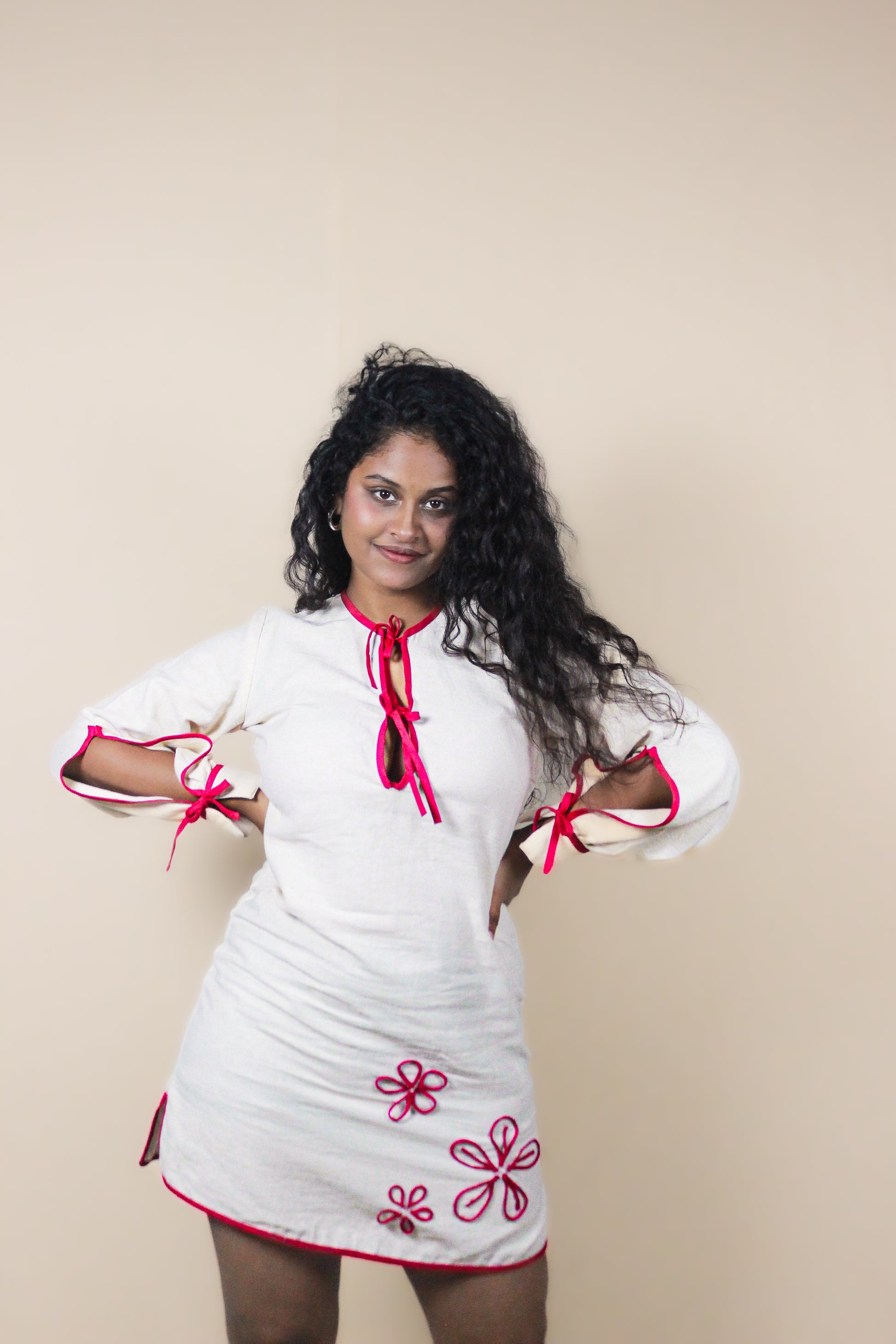 Where charm meets confidence, Blushline Bloom is a celebration of handcrafted beauty in motion. The knee-length silhouette brings an effortless, playful energy, while delicate blush-pink accents dance along the fabric like quiet notes of joy. Every running stitch is placed with intention, echoing the artistry of hands that believe in slow, thoughtful creation. Light, breezy, and unapologetically vibrant, it’s a dress made for the woman who owns her softness and her strength in equal measure - because she knows both are her power!