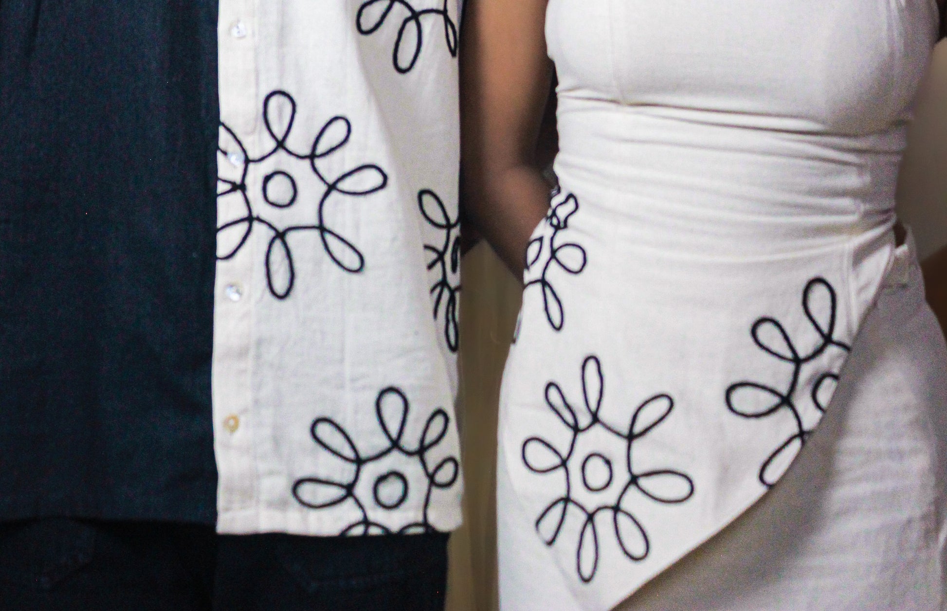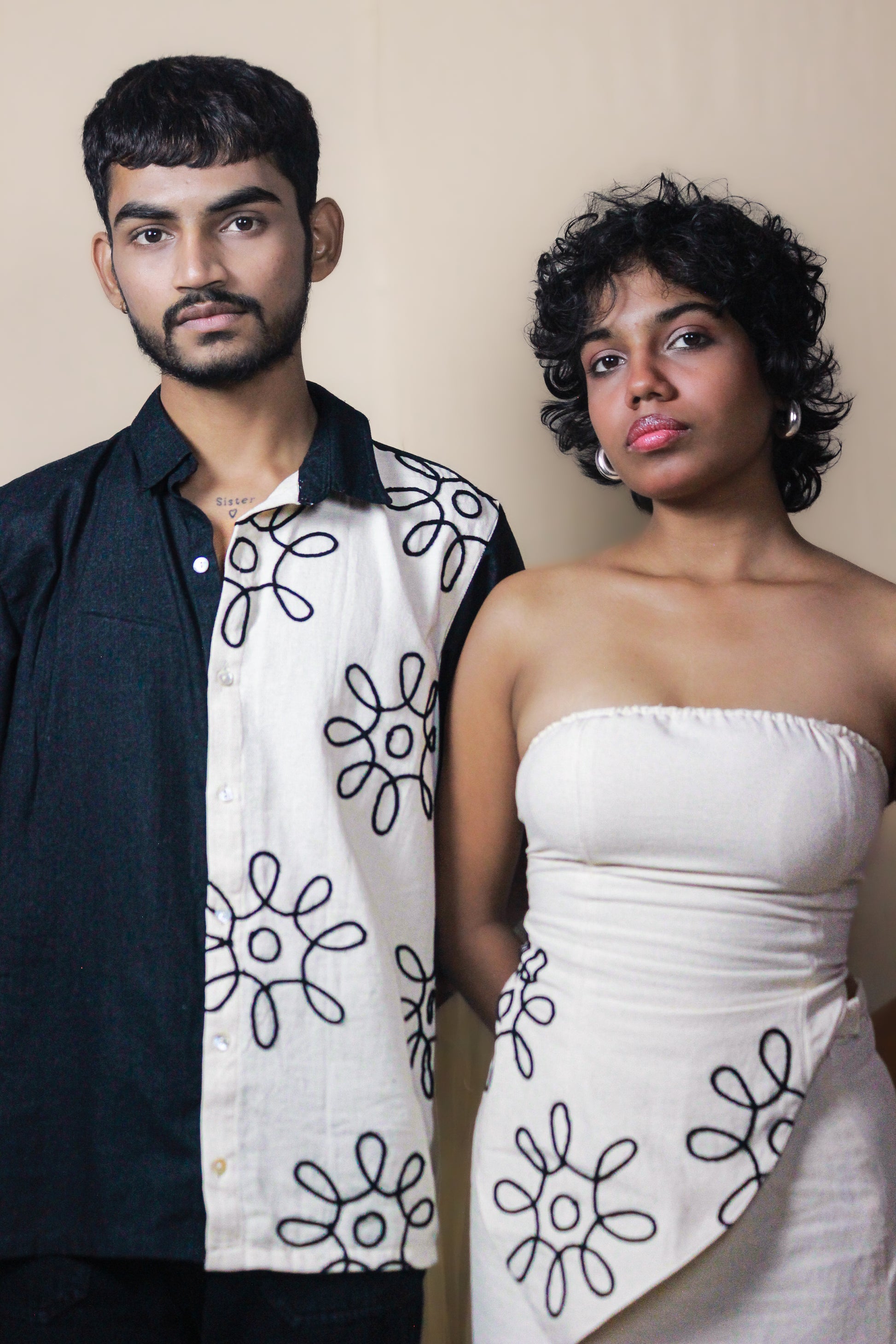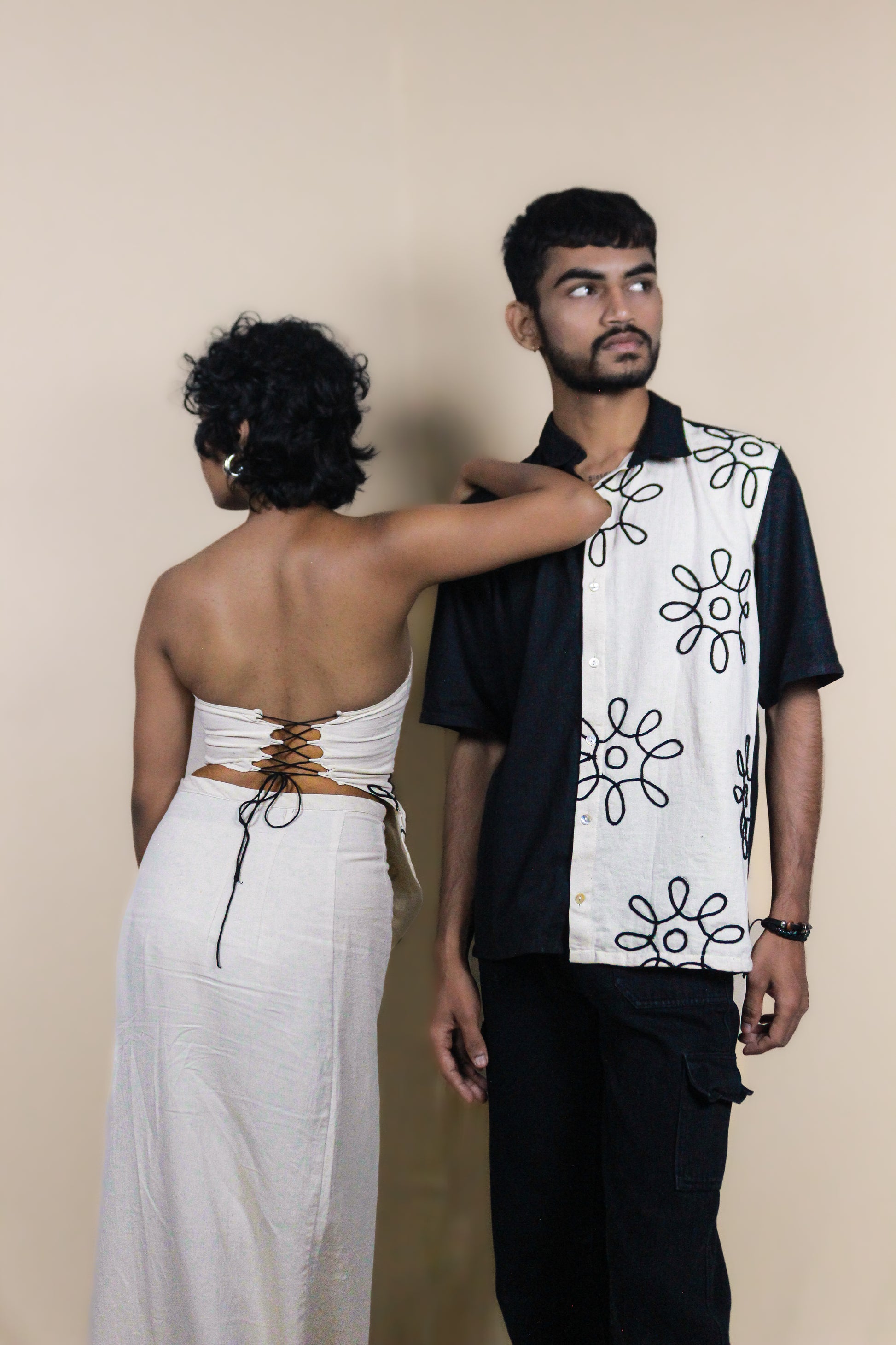 Where contrast meets harmony, Dual Muse pairs Monochrome Muse with Dual Bloom to create a striking co-ord set for two. The structured strapless corset-back top and flowing full-length slit skirt meet the delicate, handcrafted motifs of Dual Bloom, blending boldness with elegance. Each piece complements the other, forming a duo that celebrates shared style, artistry, and effortless confidence - perfect for couples who move together as one.