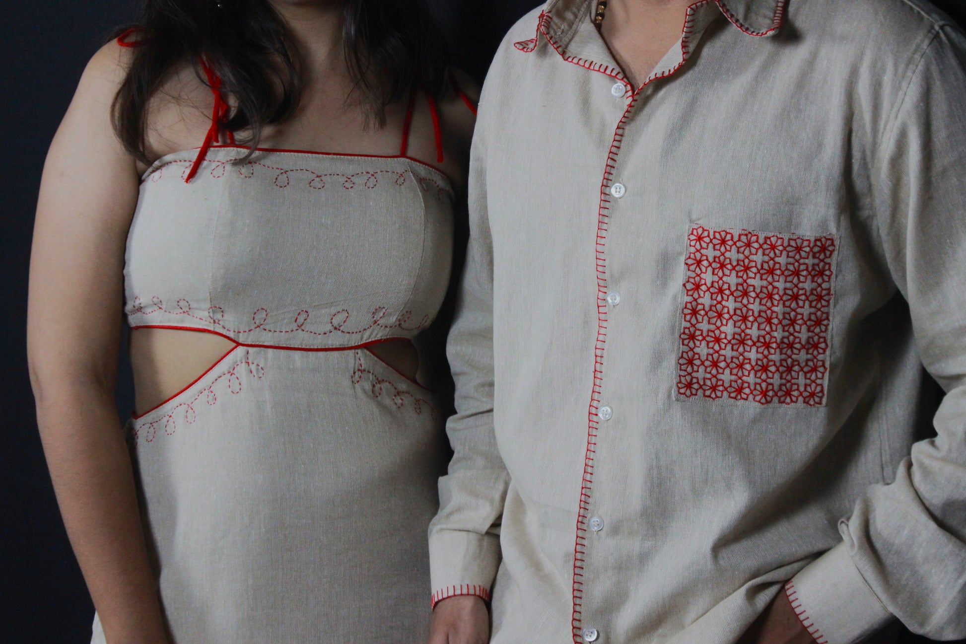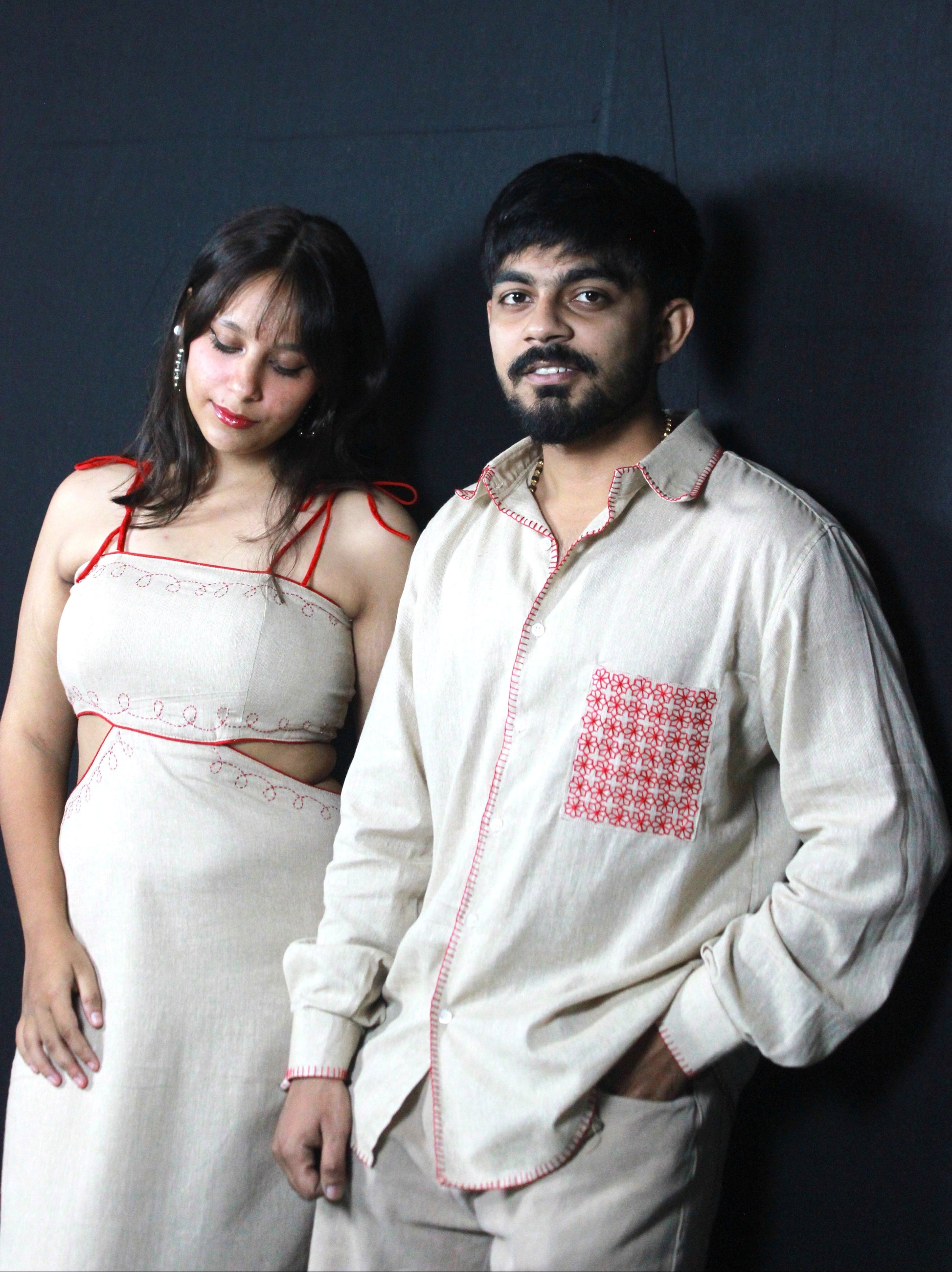 A celebration of warmth, passion, and handcrafted artistry. Ember Duo brings together Scarlet Stitch and Redline Grace in a perfect pairing of bold details and delicate precision. Each piece carries its own story - the vivid reds, intricate stitching, and flowing silhouettes - yet together they form a harmonious ensemble that speaks of connection, confidence, and shared energy. Designed for couples who move as one, Ember Duo is a statement of love, craft, and uncompromising style.