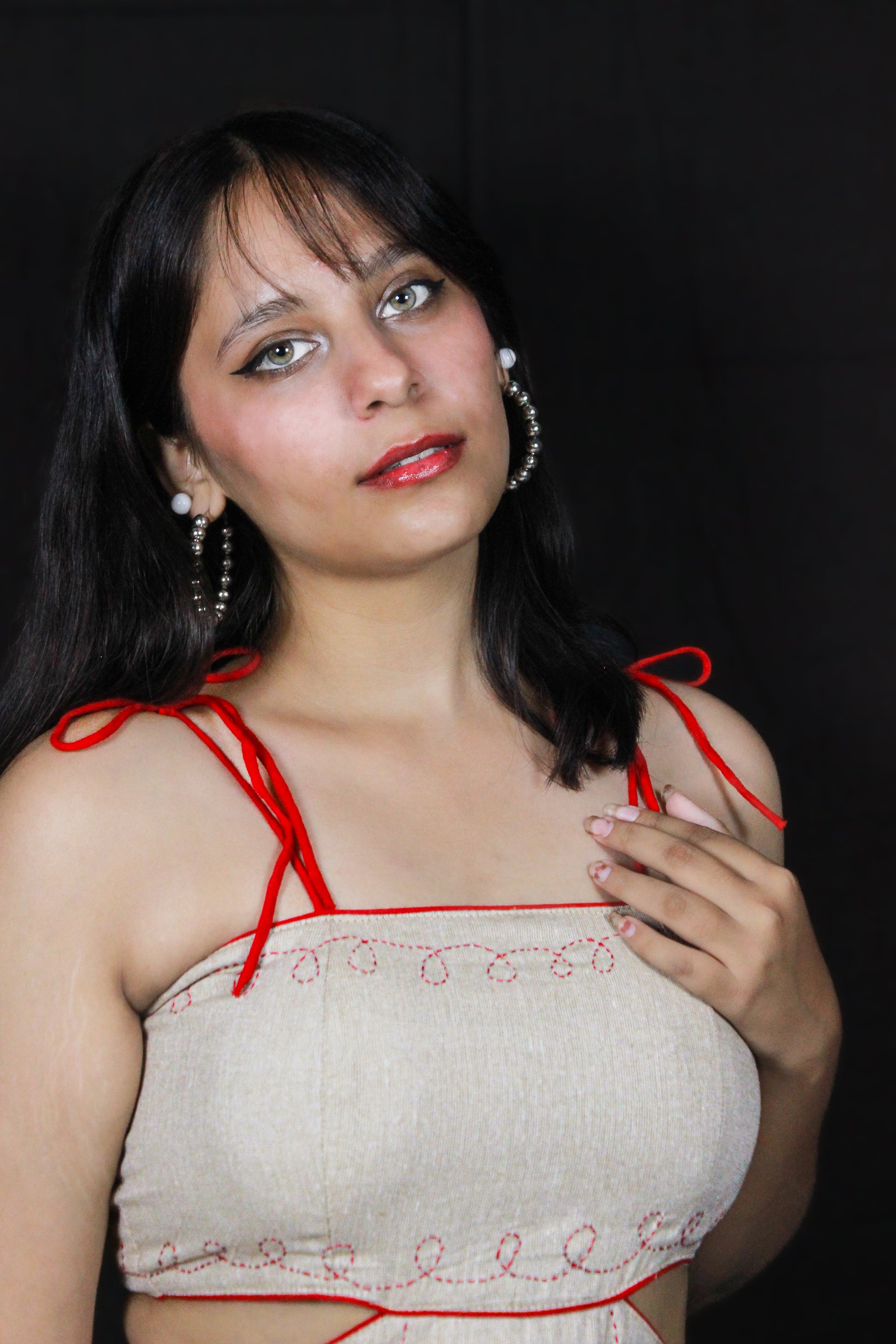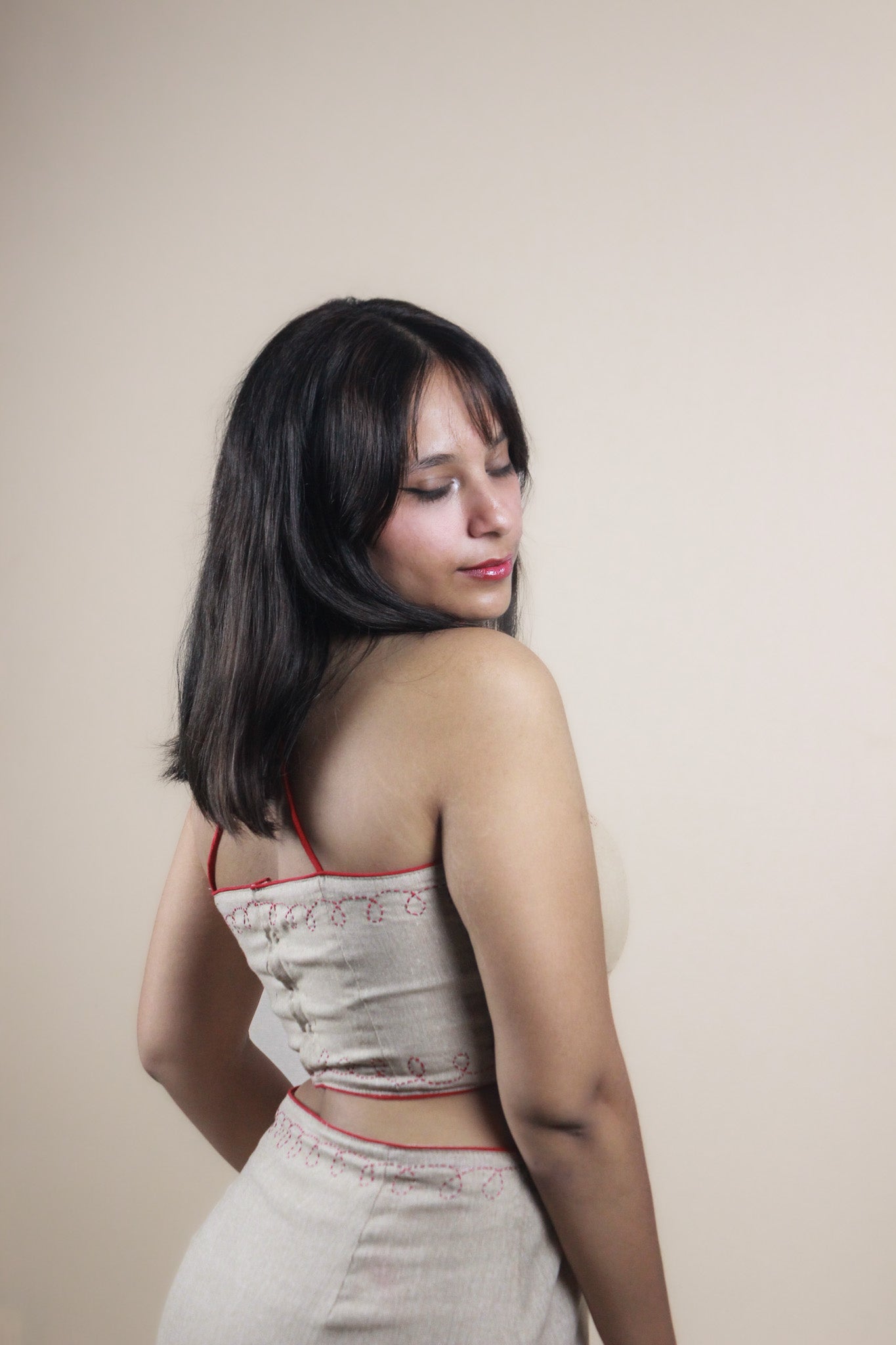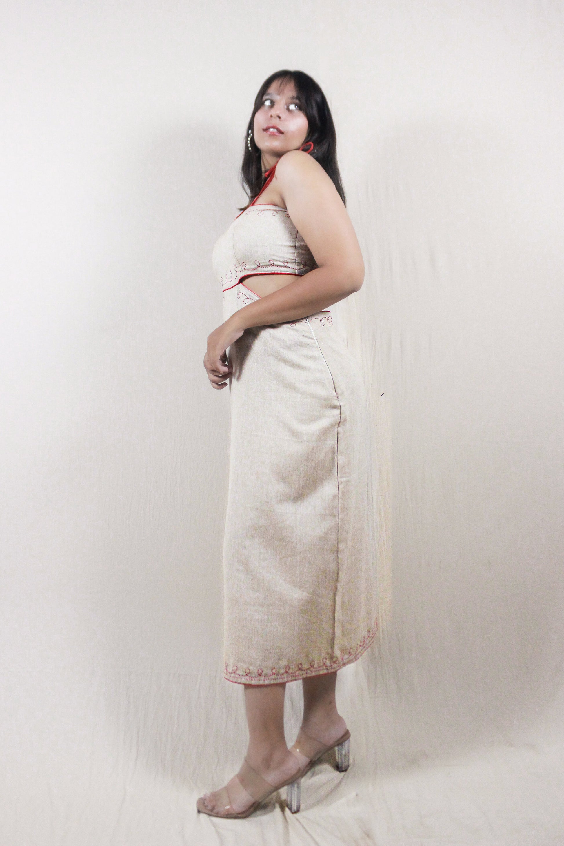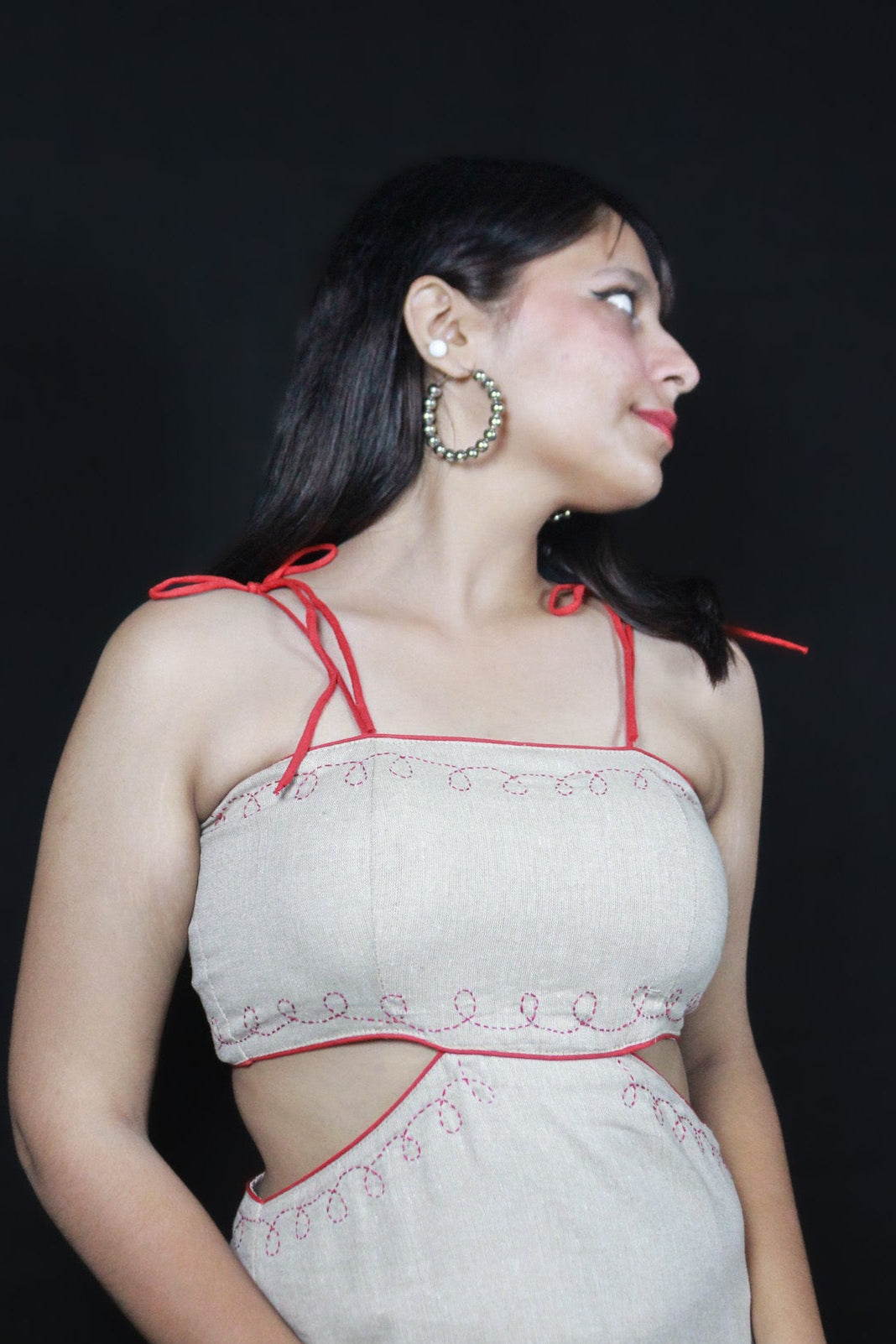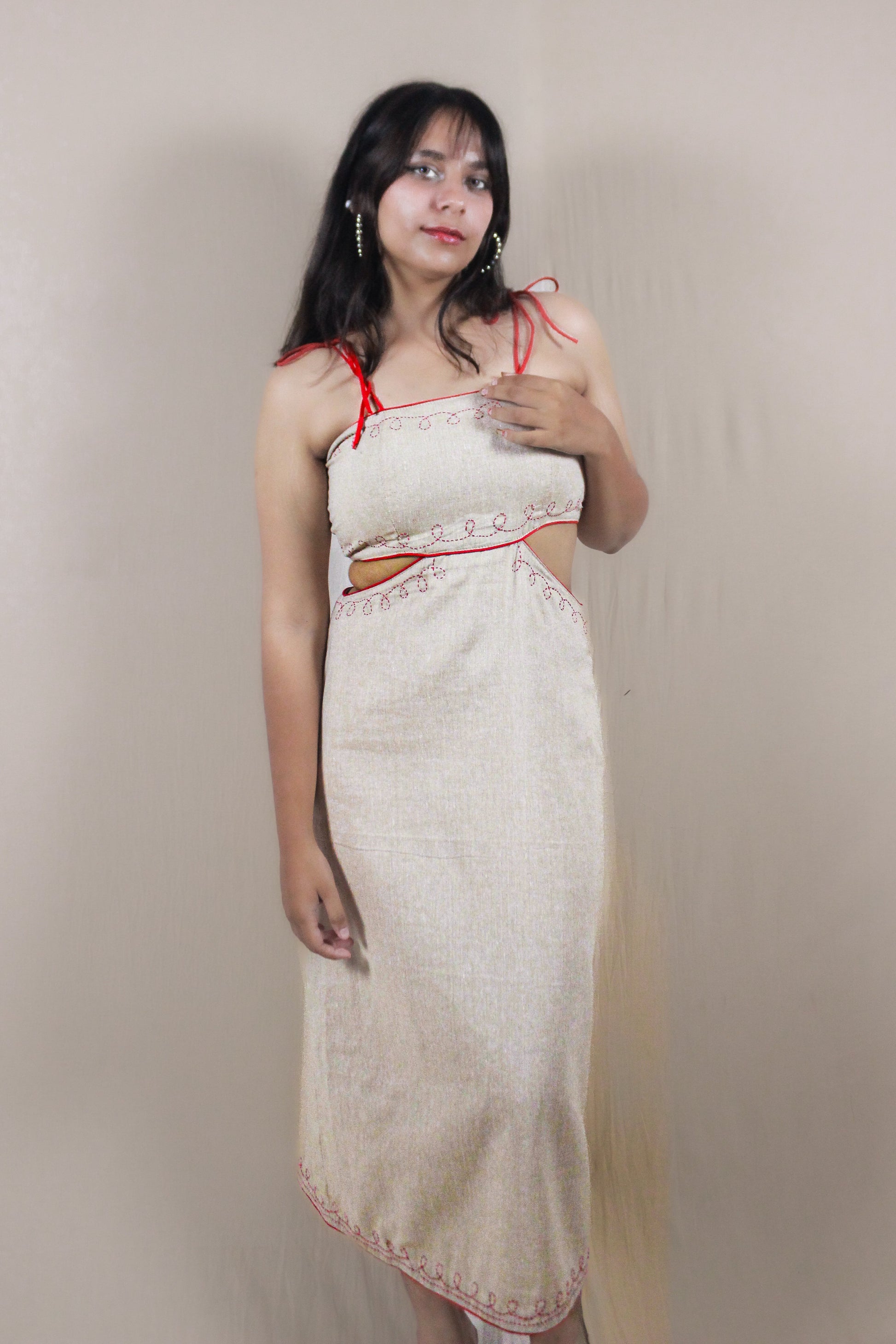 A canvas of soft beige brought to life with delicate running stitches in vivid red - each line a testament to patience, precision, and passion. This sleeveless, ankle-length silhouette flows effortlessly, letting the handcrafted details do the talking. Bold yet understated, Redline Grace is for the woman who moves with quiet confidence, leaving a trail of artistry in her wake.