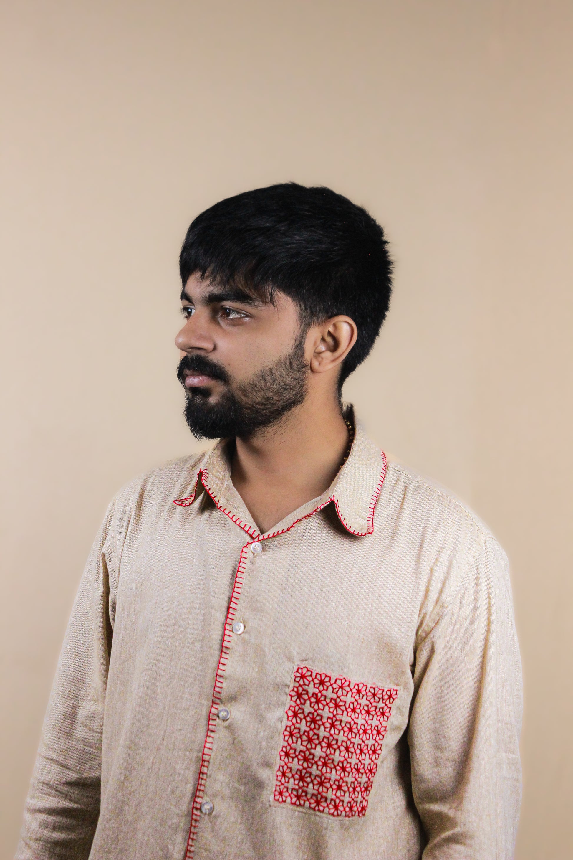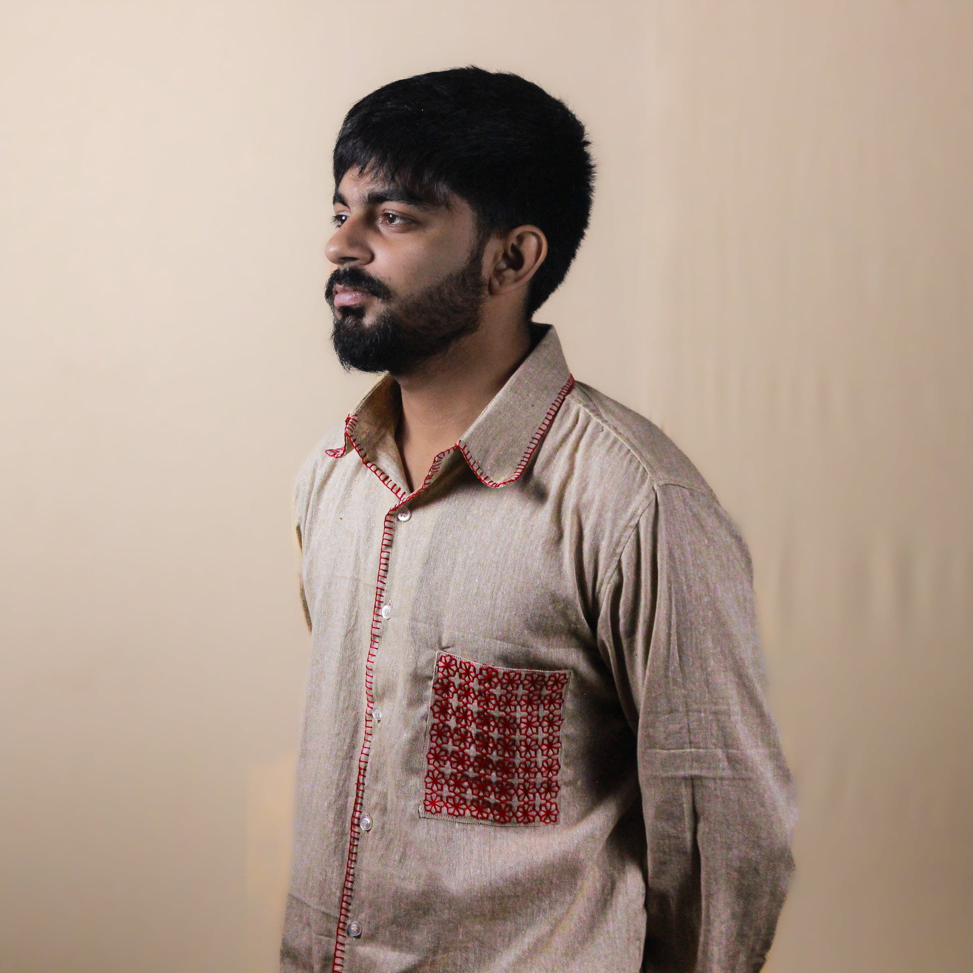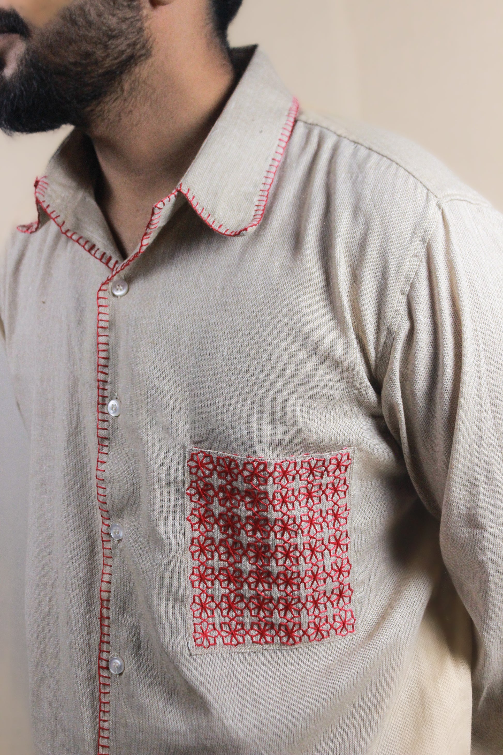 A lesson in how small details make the loudest statements. Scarlet Stitch pairs a clean, full-sleeve silhouette with handcrafted red accents - from the bold pocket to the subtle finishing touches that catch the eye up close. The deep scarlet pops against the calm base, creating a balance between precision and personality.